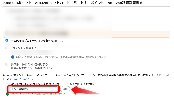 注文ページにて下記イメージの赤枠のプロモーションコードを使用するをタップ